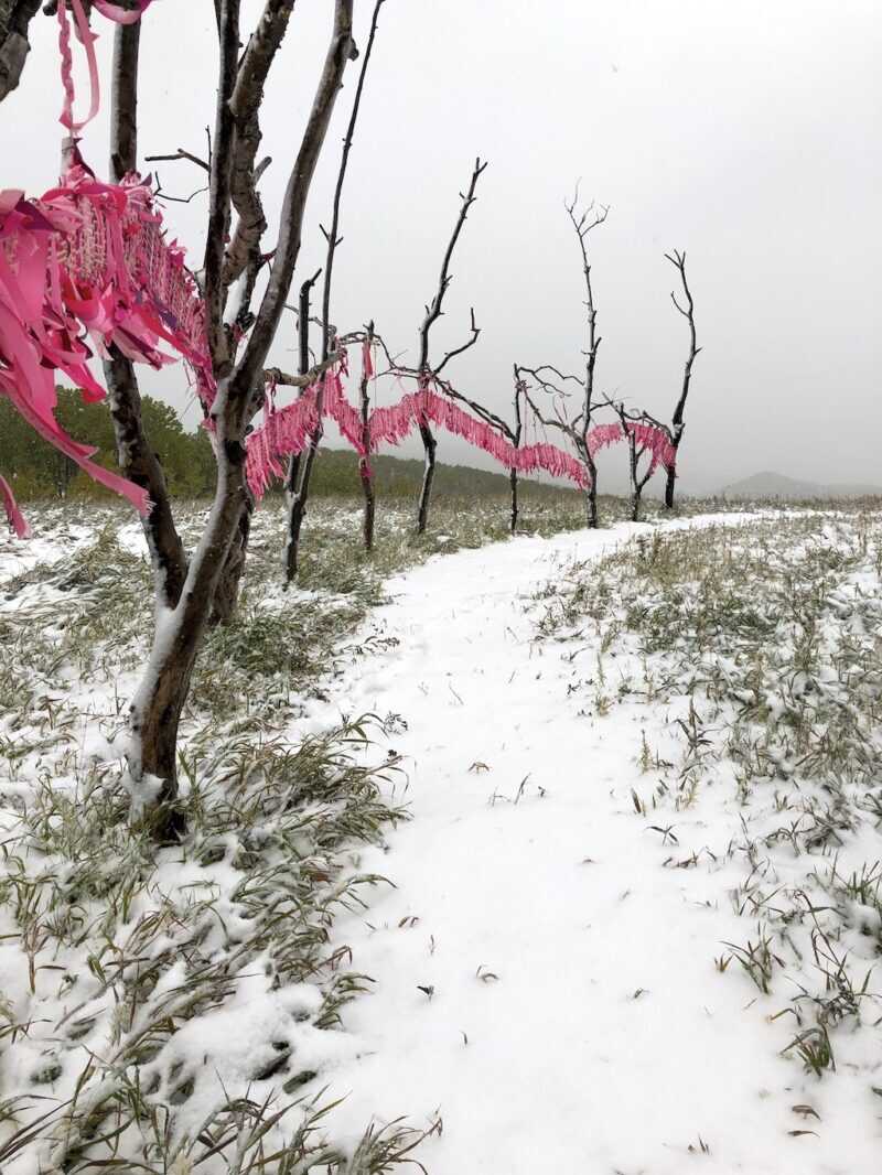 Une ligne rose frappante s’étendait sur le flanc de la colline et était visible de loin, attirant le regard le jour, puis devenant un terrain de jeu pour la faune locale la nuit. Plus de 2 000 personnes ont pris part à cette expérience immersive. Travailler avec Patricia Lortie sur ce projet porteur de sens a été un véritable honneur.